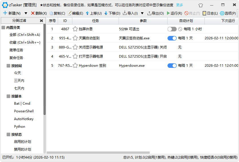 zTasker是一个定时/热键自动化任务工具,可以采用定时或热键的方式执行多种自动化任务,支持50+种任务类型,20+种定时/条件执行方法,任务列表随意编辑、排列、移动、更改类型,支持任务执行日志,支持任务列表等数据的备份,支持任务日志,支持。