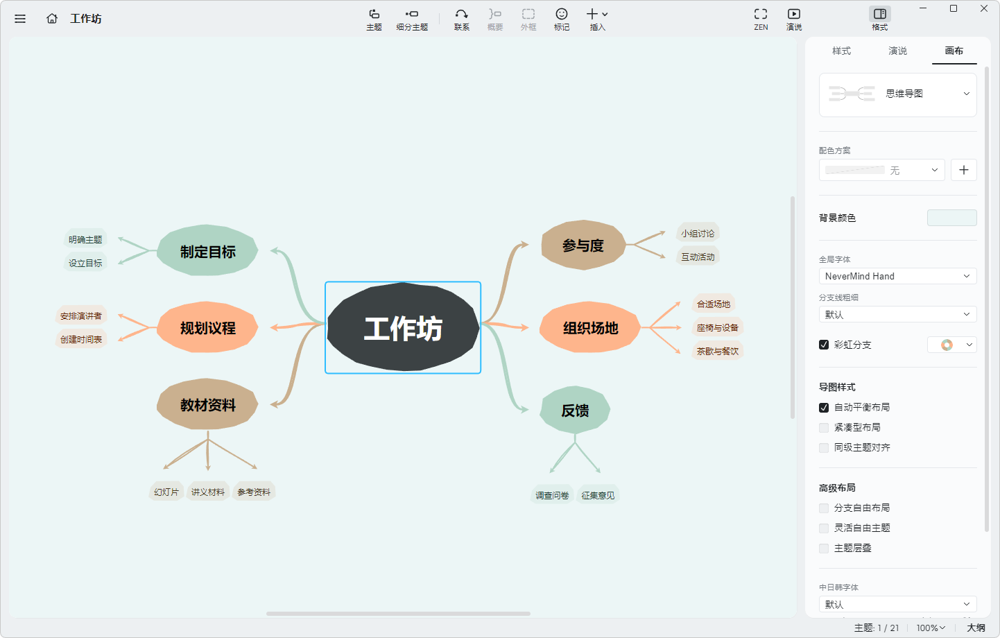 多样的主题模板:XMind 提供了丰富的主题模板,涵盖了商务、教育、创意等多个领域。这些模板具有不同的配色方案和样式风格,用户可以根据具体需求和使用场景快速选择合适的主题,使思维导图在视觉上更加美观和专业。