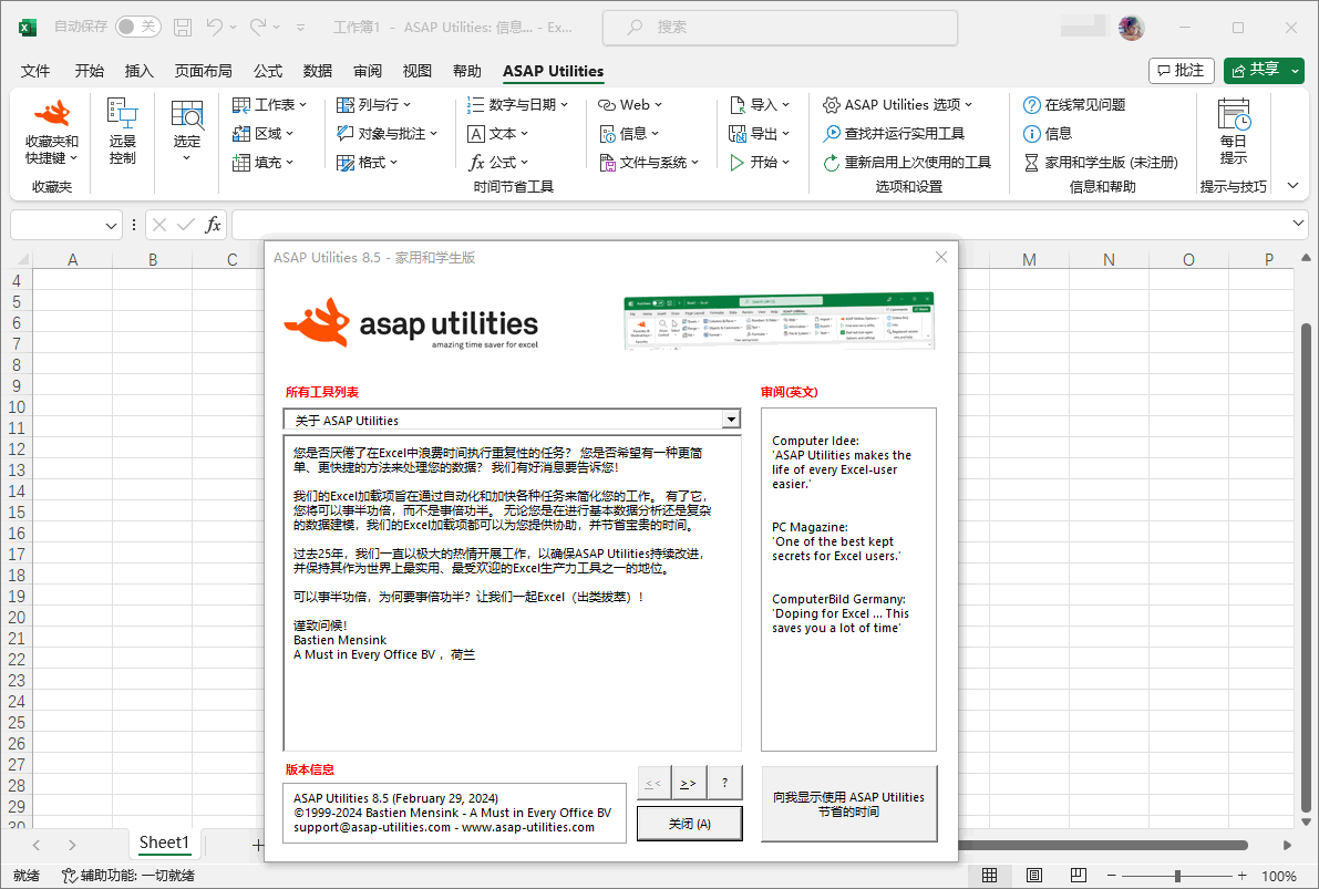 ASAP Utilities 适用于 Excel 2010-2021/365+ ,其他版本可能无法使用
