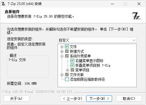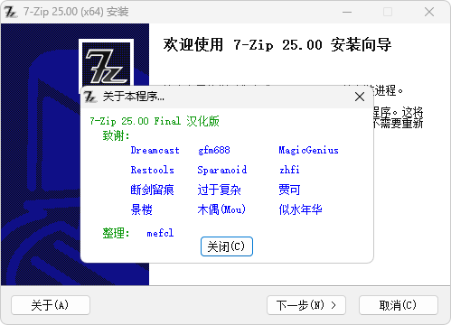 7-Zip 是一款免费的文件压缩/解压软件,拥有极高的压缩率。它特有的高解压速率,是其它的压缩软件难以相比的。它源自 LZ77 的优化改进的 LZMA 算法,具有高压缩率、可变的字典大小、高解压速率、低解压内存消耗等优点,现已被很多脚本安装程序作为默认的压缩算法。LZMA 算法在 GNU LGPL 协议下开放源代码,您可以从 7-Zip 官方网站或者 SF 服务器下载使用。7-Zip 支持的压缩格式非常之多,包括独有的 7z 文件,压缩与解压 7z、XZ、BZIP2、GZIP、TAR、ZIP、WIM 文件,以及解压 APFS、AR、ARJ、Base64、CAB、CHM、CPIO、CramFS、DMG、EXT、FAT、GPT、HFS、IHEX、ISO、LZH、LZMA、MBR、MSI、NSIS、NTFS、QCOW2、RAR、RPM、SquashFS、UDF、UEFI、VDI、VHD、VHDX、VMDK、XAR、Z、ZSTD 等文件。